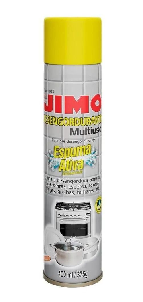 Detergente concentrado, especialmente desenvolvido para desengordurar e facilitar a limpeza de fornos, fogões, cooktops, grelhas, micro-ondas, coifas, grills, panelas, espetos, assadeiras, louças, azulejos, boxes de banheiro e demais superfícies laváveis. A espuma de jimo desengordurante multiuso não contém soda cáustica. Seu princípio ativo age rapidamente, dissolvendo a sujeira e garantindo uma limpeza eficaz. O produto é dermatologicamente testado.